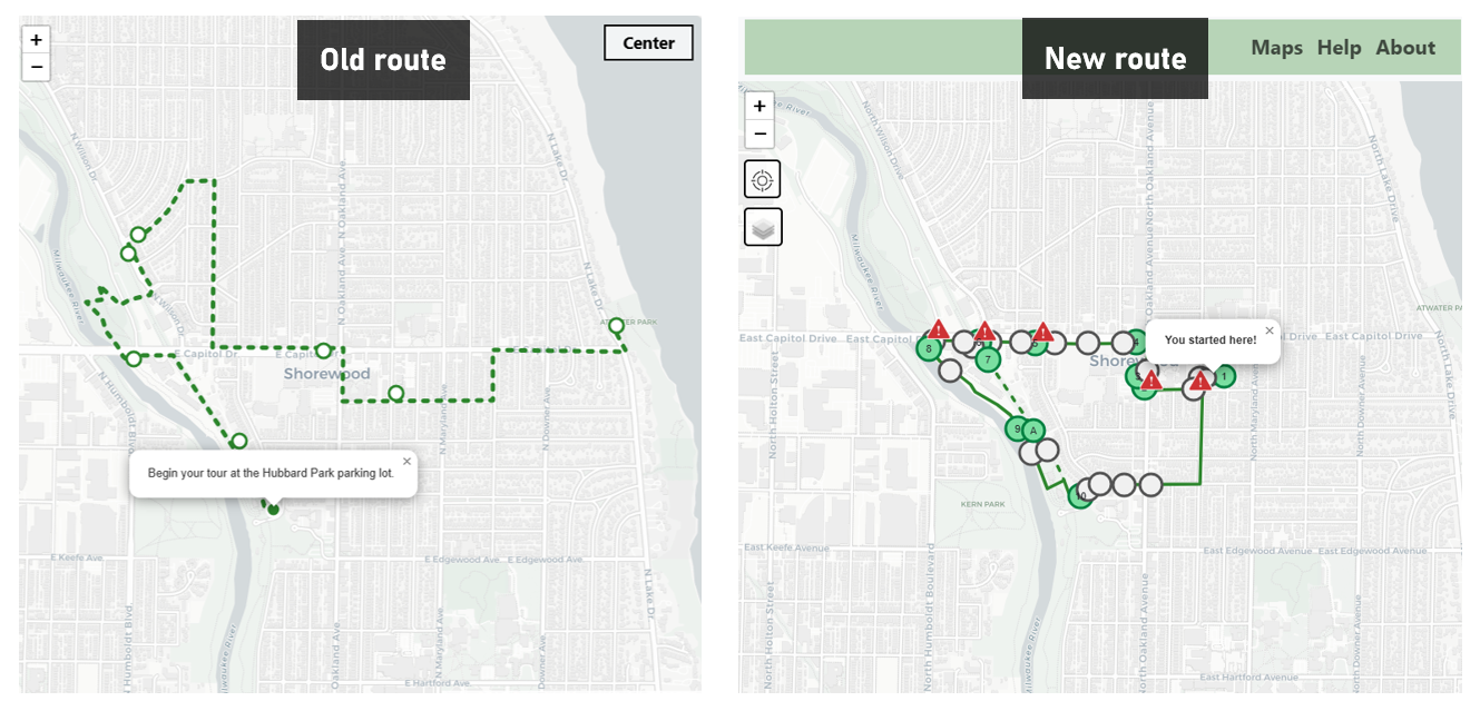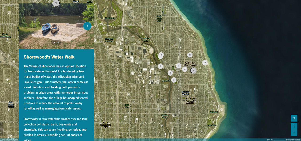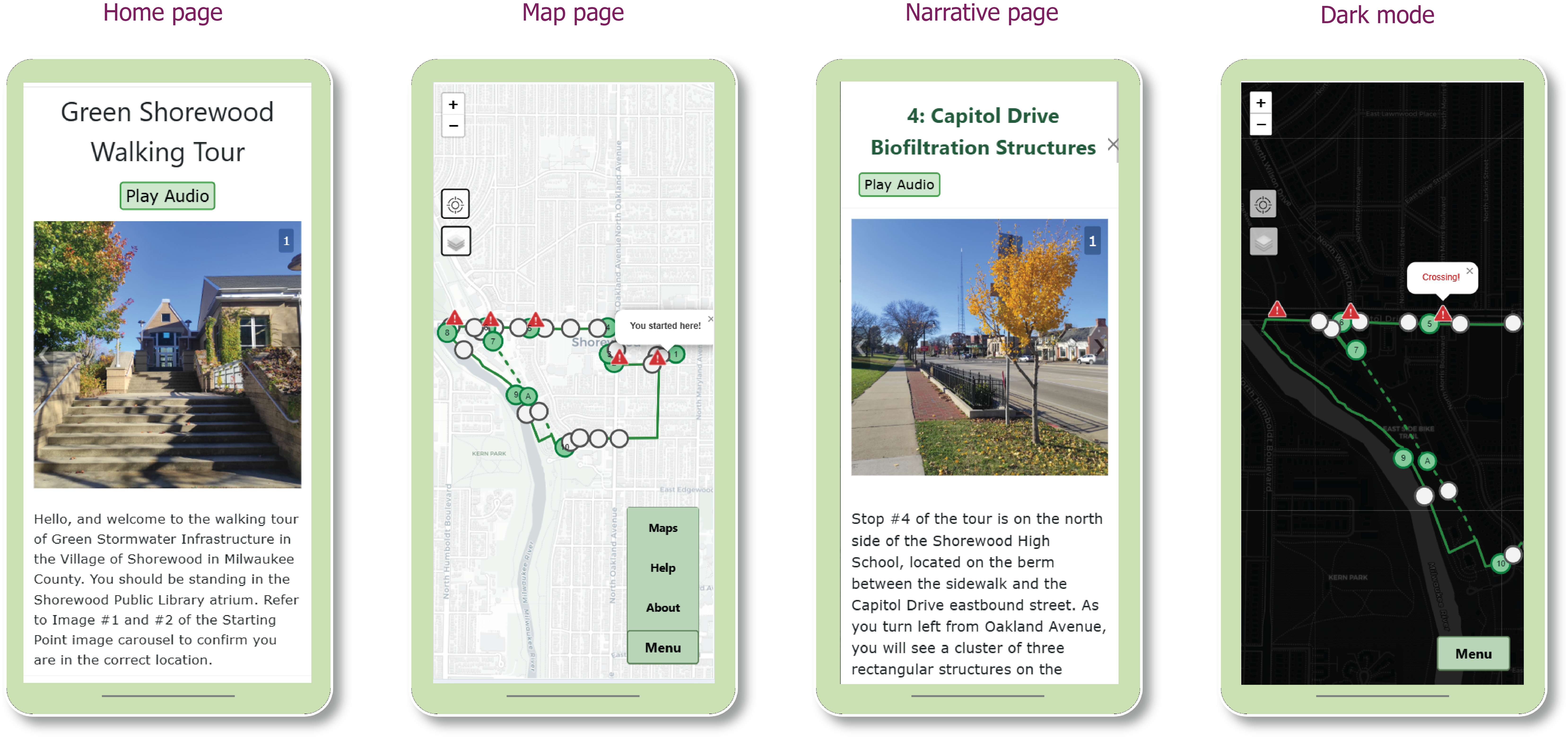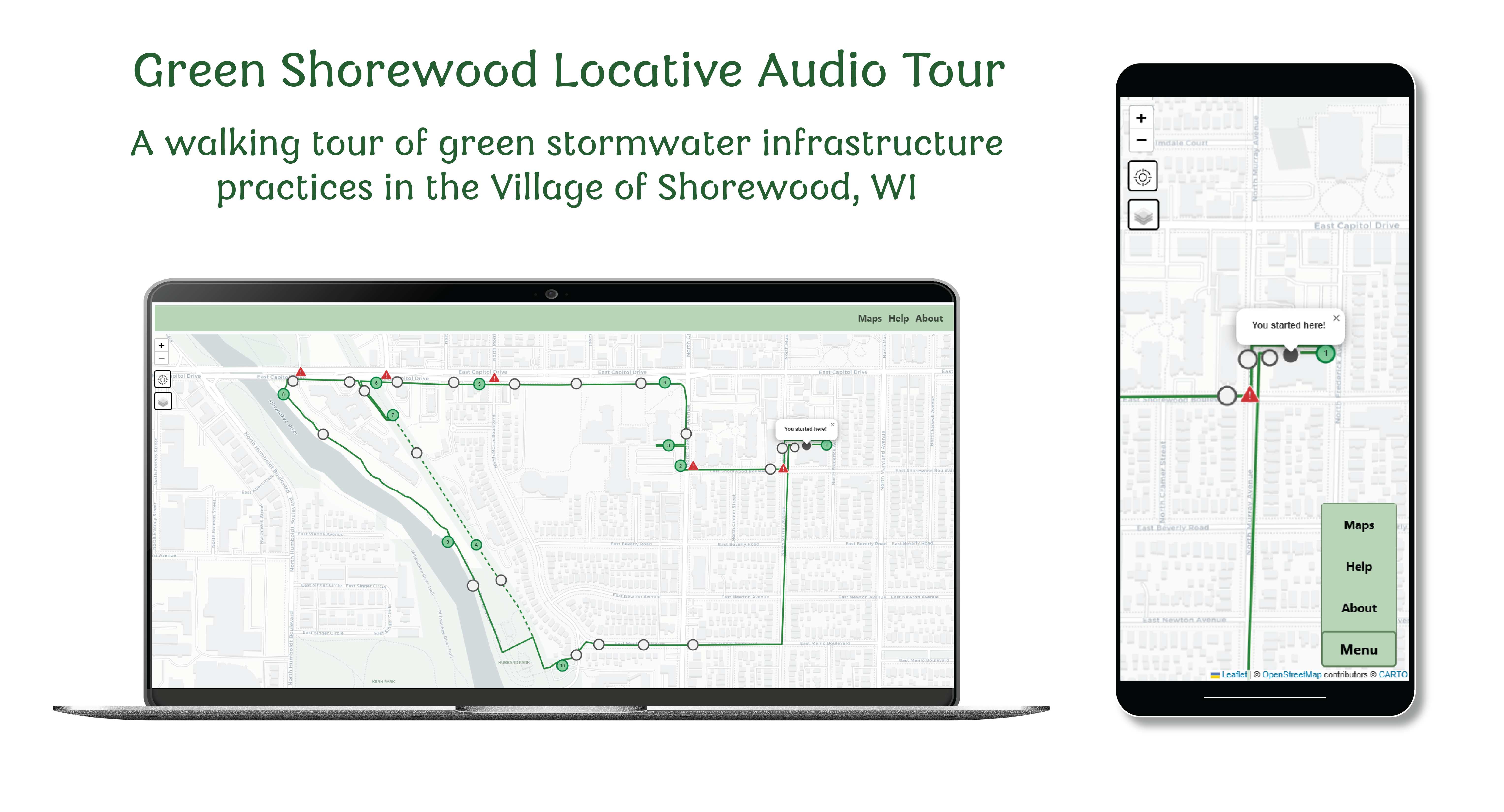 We developed a locative audio mobile guided tour of recent and planned green stormwater infrastructure projects in the Village of Shorewood, Wisconsin. We created three versions of the same tour using VoiceMap and Echoes, apps selected from our competitive analysis samples for their functionalities. We also built our own custom web app using Leaflet.js. The story content was taken from an already existing storymap created by our partners in Milwaukee (https://storymaps.arcgis.com/stories/63a66207e2eb4893a4d1d7f2de654c9d).